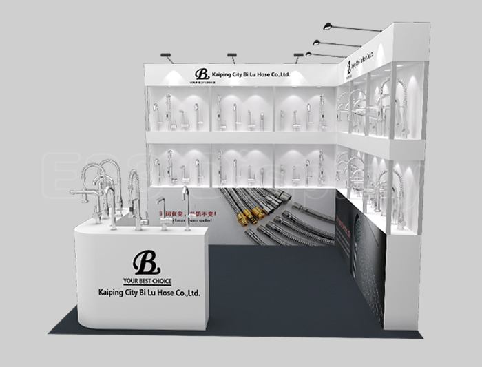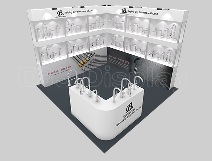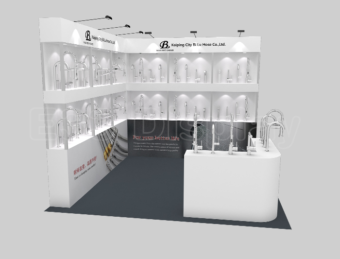 溫馨提示:如你想?yún)⒄者@設(shè)計圖DIY設(shè)計構(gòu)思你想要的展臺,此造型結(jié)構(gòu)適用3x3m以下方形展位,你可增加你想要的展示功能或更多的引人注目特裝造型。