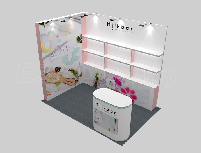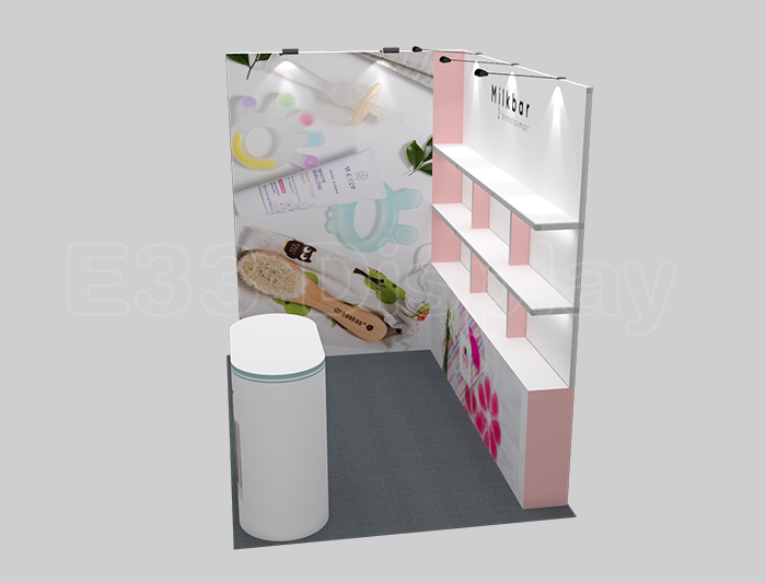 如你想?yún)⒄者@設(shè)計圖DIY設(shè)計構(gòu)思你想要的展臺,此造型結(jié)構(gòu)適用2x3m以下方形展位,你可增加你想要的展示功能或更多的引人注目特裝造型。