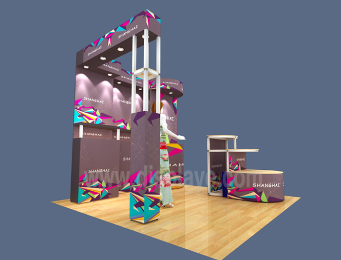 溫馨提示:如你想?yún)⒄者@設(shè)計(jì)圖DIY設(shè)計(jì)構(gòu)思你想要的展臺,此造型結(jié)構(gòu)適用5x5m以下方形展位,你可增加你想要的展示功能或更多的引人注目特裝造型。