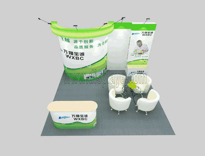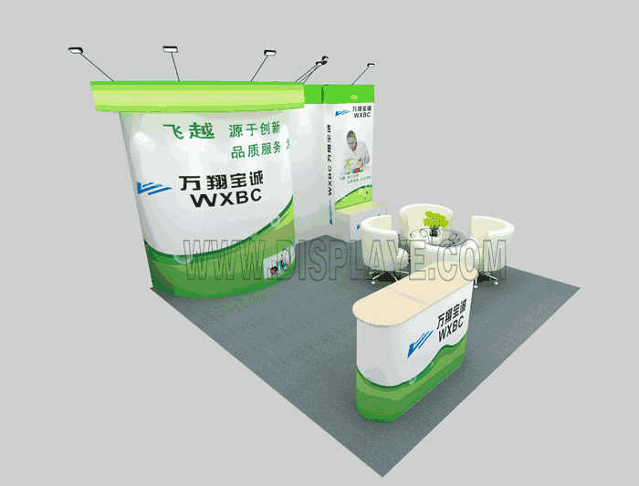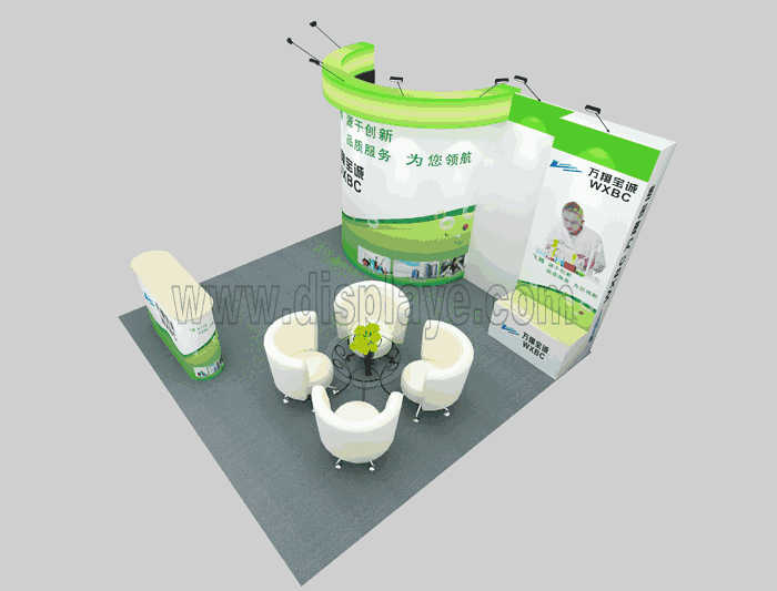 溫馨提示:如你想?yún)⒄者@設(shè)計(jì)圖DIY設(shè)計(jì)構(gòu)思你想要的展臺(tái),此造型結(jié)構(gòu)適用3x3m以下方形展位,你可增加你想要的展示功能或更多的引人注目特裝造型。