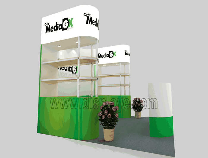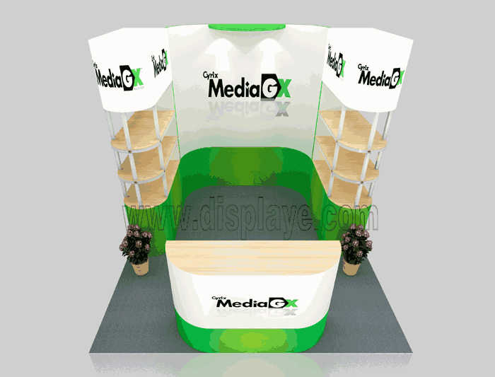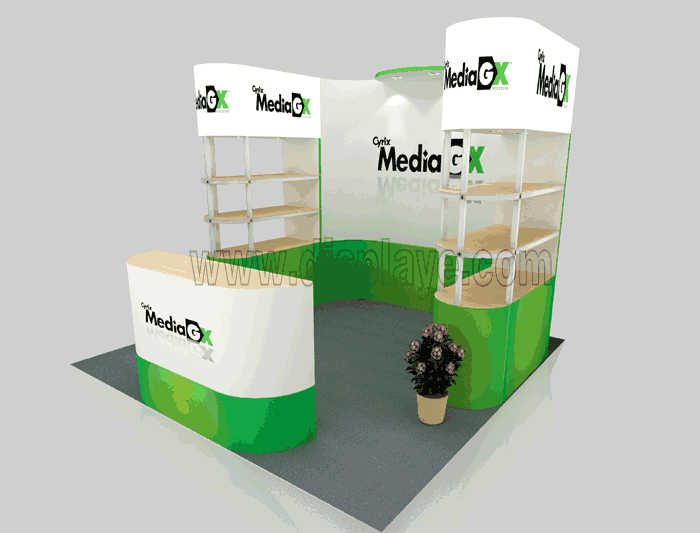 溫馨提示:如你想?yún)⒄者@設(shè)計(jì)圖DIY設(shè)計(jì)構(gòu)思你想要的展臺,此造型結(jié)構(gòu)適用3x3m以下方形展位,你可增加你想要的展示功能或更多的引人注目特裝造型。