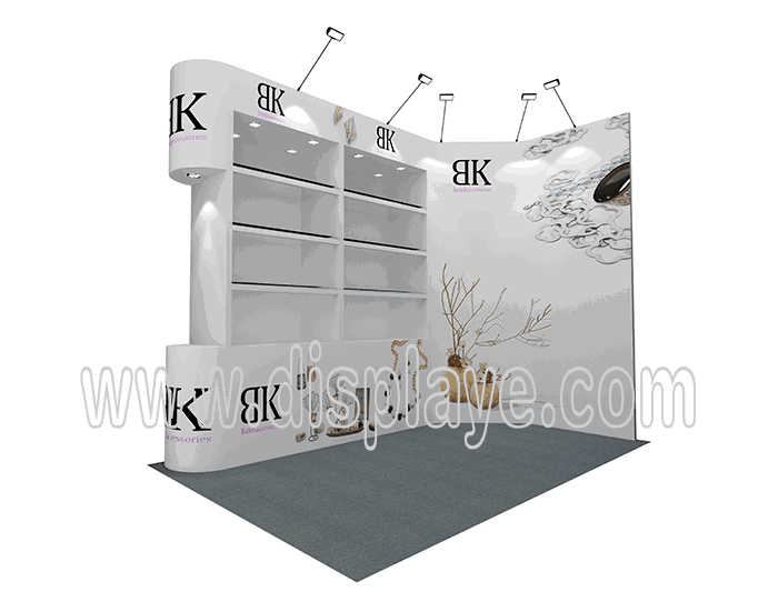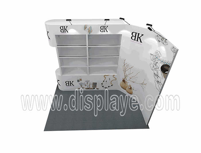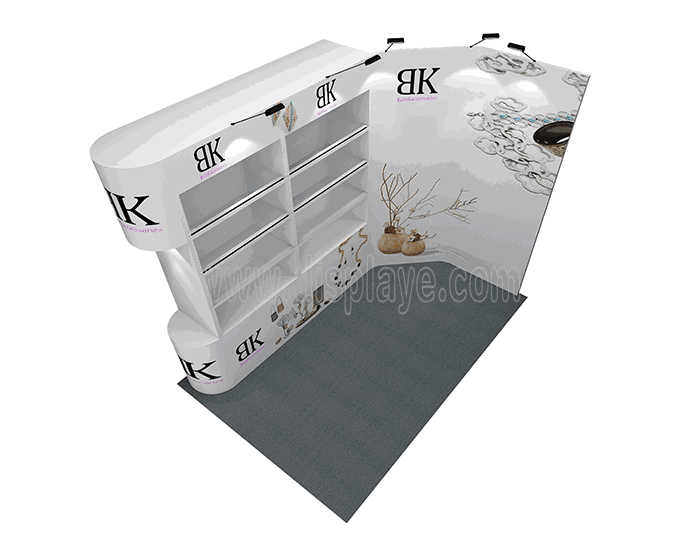 溫馨提示:如你想?yún)⒄者@設(shè)計圖DIY設(shè)計構(gòu)思你想要的展臺,此造型結(jié)構(gòu)適用3x2m以下方形展位,你可增加你想要的展示功能或更多的引人注目特裝造型。