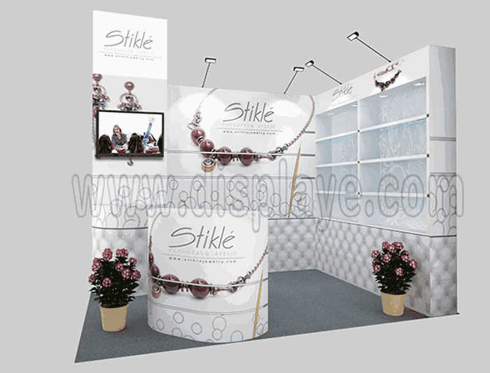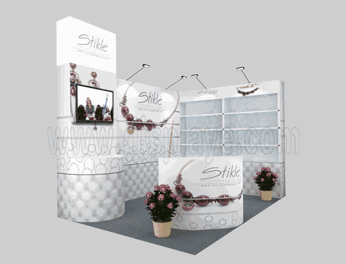 溫馨提示:如你想?yún)⒄者@設(shè)計圖DIY設(shè)計構(gòu)思你想要的展臺,此造型結(jié)構(gòu)適用3x3m以下方形展位,你可增加你想要的展示功能或更多的引人注目特裝造型。