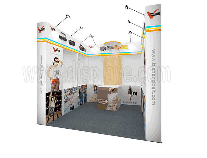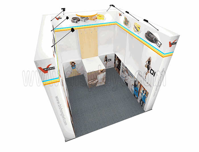 溫馨提示:如你想?yún)⒄者@設(shè)計(jì)圖DIY設(shè)計(jì)構(gòu)思你想要的展臺,此造型結(jié)構(gòu)適用3x3m以下方形展位,你可增加你想要的展示功能或更多的引人注目特裝造型。