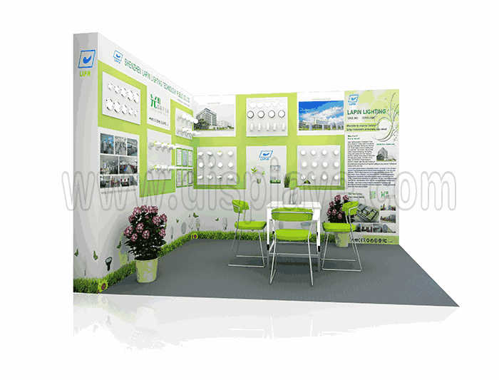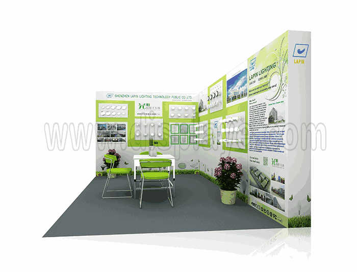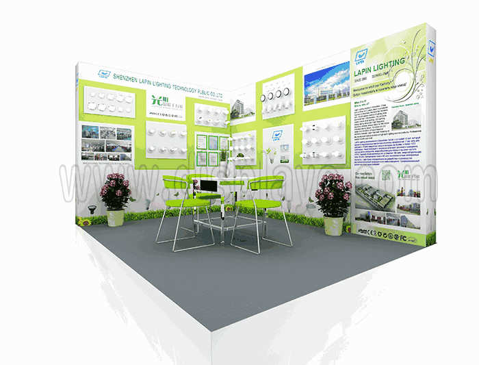 溫馨提示:如你想?yún)⒄者@設(shè)計圖DIY設(shè)計構(gòu)思你想要的展臺,此造型結(jié)構(gòu)適用3x3m以下方形展位,你可增加你想要的展示功能或更多的引人注目特裝造型。