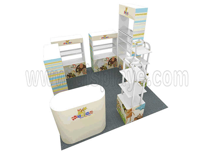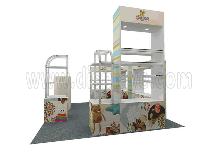 溫馨提示:如你想?yún)⒄者@設(shè)計(jì)圖DIY設(shè)計(jì)構(gòu)思你想要的展臺(tái),此造型結(jié)構(gòu)適用3x3m以下方形展位,你可增加你想要的展示功能或更多的引人注目特裝造型。