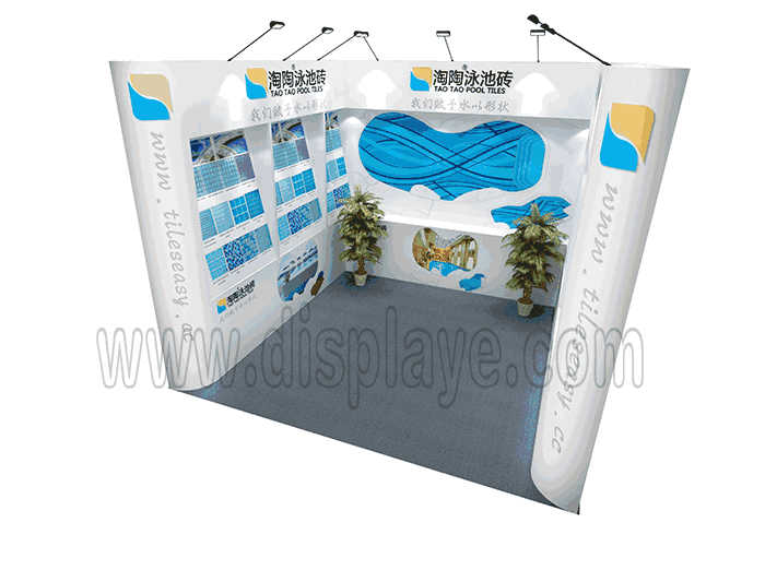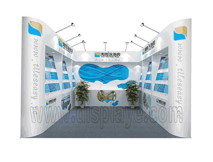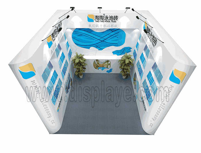 溫馨提示:如你想?yún)⒄者@設計圖DIY設計構思你想要的展臺,此造型結構適用3x3m以下方形展位,你可增加你想要的展示功能或更多的引人注目特裝造型。