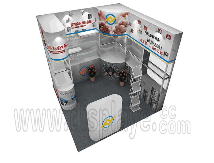 溫馨提示:如你想?yún)⒄者@設(shè)計圖DIY設(shè)計構(gòu)思你想要的展臺,此造型結(jié)構(gòu)適用3x3m以下方形展位,你可增加你想要的展示功能或更多的引人注目特裝造型。