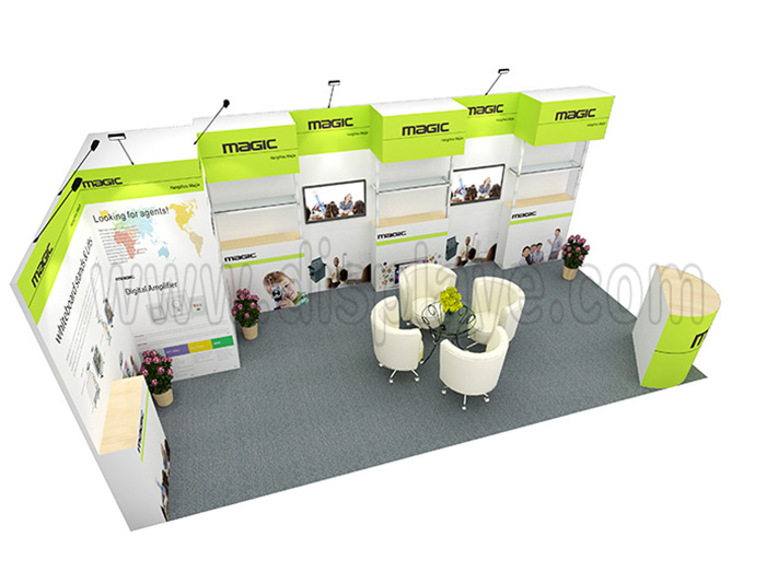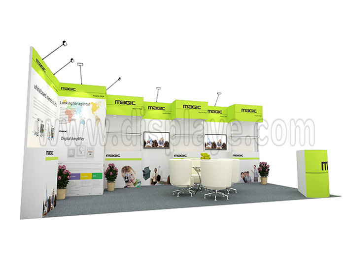 Tips: If you want to DIY design your own stand, this modeling structure applies to 3x6m square booth or below, you can increase more exhibition function or more striking customized modeling.