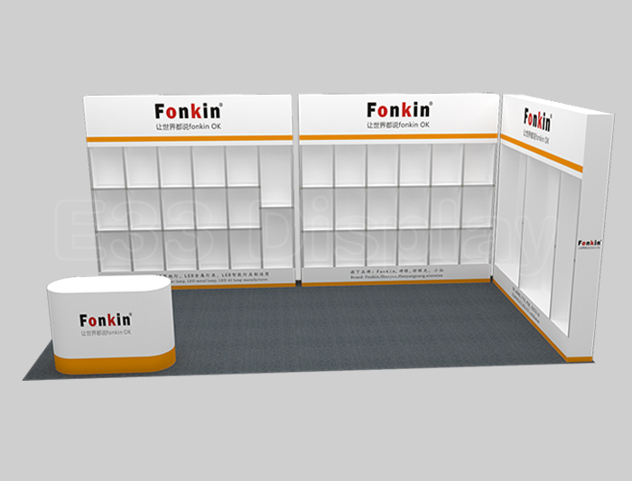 Tips: If you want to DIY design your own stand, this modeling structure applies to 3x6m square booth or below, you can increase more exhibition function or more striking customized modeling.